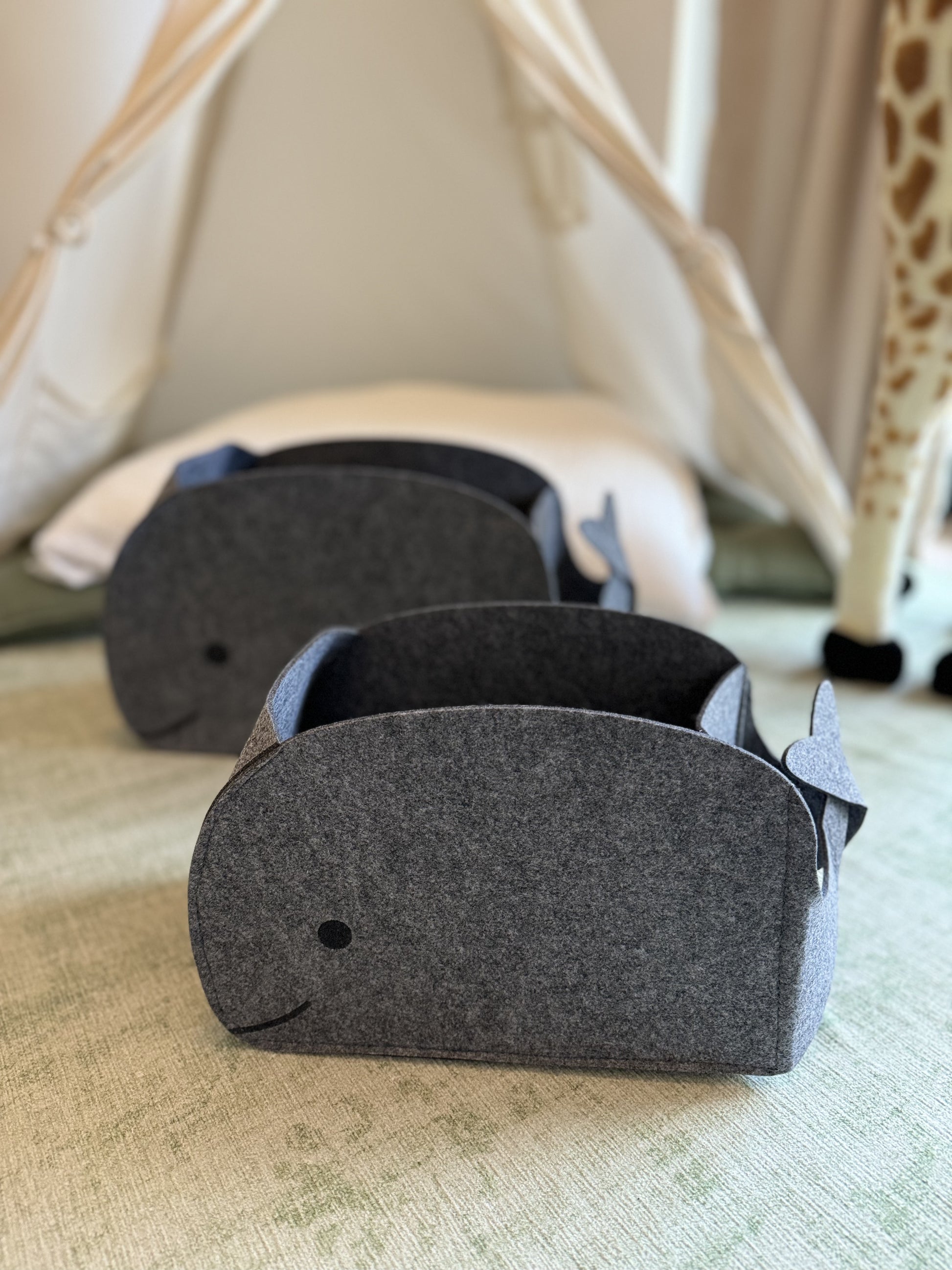 Die süssen Wal-Körbe aus Filz sind nicht nur ein Hingucker im Kinderzimmer, sondern schaffen auch Ordnung.