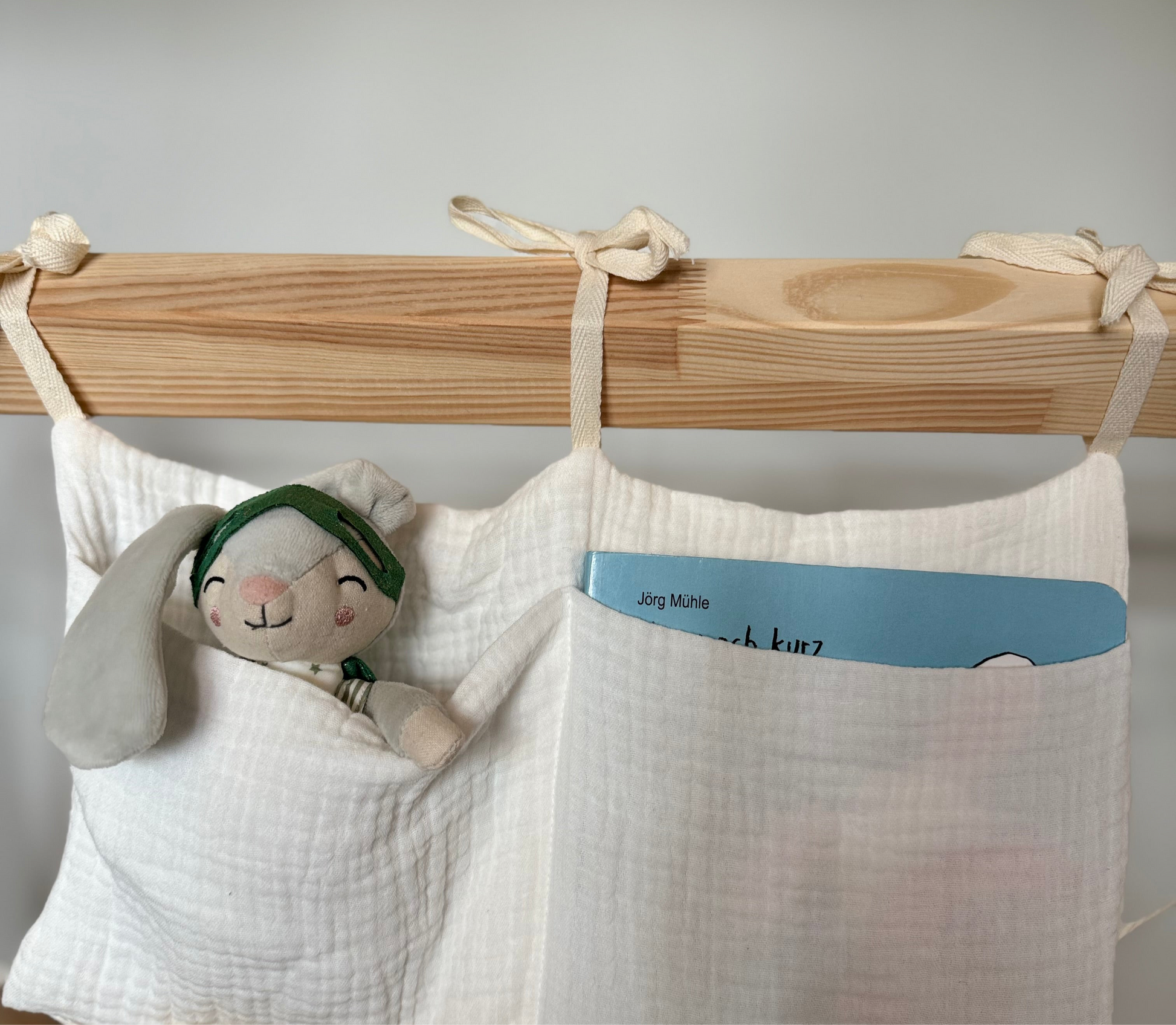 Dieser praktische Organizer schafft mehr Platz und Stauraum für Baby Utensilien wie zum Beispiel Windeln, Kleider oder auch Spielzeug. Der Organizer hat zwei grosse Hauptfächer, welche sich auch ideal fürs Verstauen der Kuscheltiere eignen. Er kann schnell und einfach am Babybett befestigt werden.